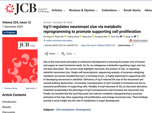 近日,南通大学王新博士在国际权威期刊《Journal of Cell Biology》(JCB)发表最新研究成果,论文题为“Irg1l regulates neuromast size via metabolic reprogramming to promote supporting cell proliferation”。研究发现,代谢酶 Irg1l 及其产物 Itaconate(衣康酸)能通过调控代谢重编程促进支持细胞增殖,从而决定感觉器官大小,首次揭示了代谢信号参与器官发育调控的新机制。