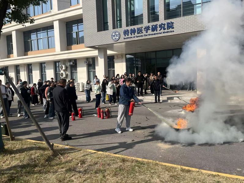 14日下午的消防演练聚焦实验室初级火灾应对,火盆模拟易燃物引发火情的场景。消防科于小冬科长现场指导,并详细介绍了干粉灭火器和二氧化碳灭火器的使用和注意事项,他强调“一提二拔三对准四压”的灭火器操作要诀,并针对实验室特殊环境讲解火灾扑救注意事项。每位参与的研究生都进行了实战操作,他们表示:“实战演练让我真正掌握了灭火技巧,遇到突发情况能冷静应对。”