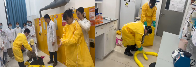 第二项为“管制类化学品事故专项演练”,由彭彬老师严格按照《南通大学易制爆危险化学品事故应急预案》组织实施。彭老师首先在16-A107实验室讲解了化学品泄漏处置的流程和注意事项,并指导学生如何做好个人防护。演练模拟16- A109实验室发生管制类化学品泄漏场景,参演人员规范穿戴防护服、防毒口罩、防化手套等防护装备,快速隔离泄漏区域并设置警示标识,严禁无关人员及火源靠近;按流程上报泄漏情况后,根据化学品特性开展泄漏处置、污染清理及废弃物规范转运,并对接触人员进行模拟检查与消毒,处置流程科学严谨、衔接有序。